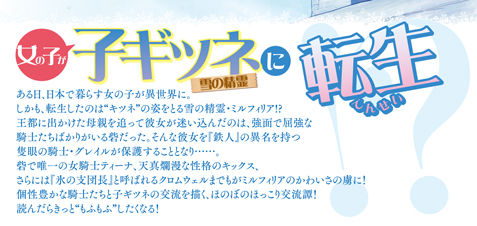 砦で唯一の女性騎士ティーナや『少年の心』を持つキックスら砦の騎士たちは彼女の魅力にメロメロ! 一人、彼女に素っ気ない態度をとるクールな『氷の支団長』クロムウェルも実は……。 個性豊かな騎士たちと子ギツネとの日常を描いた、ほのぼのほっこり交流譚です。